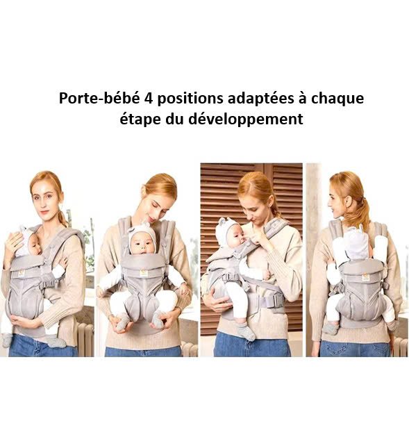 - Il propose 4 positions de portage : face au porteur, face vers l’avant, sur la hanche et sur le dos.